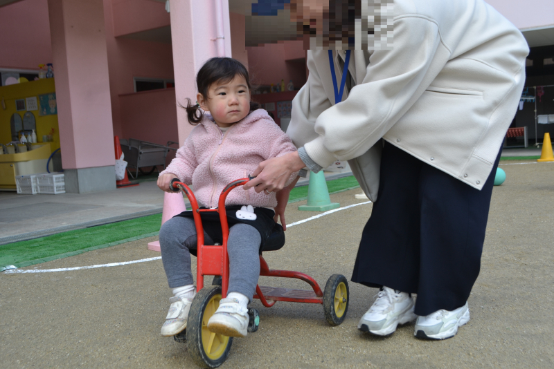 三輪車に挑戦するお友達や、お砂場でごはんを作って楽しむお友達がいました♡