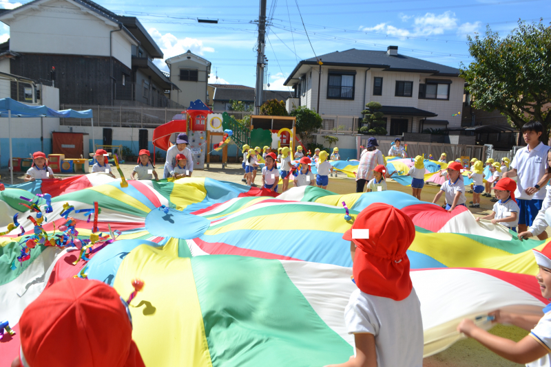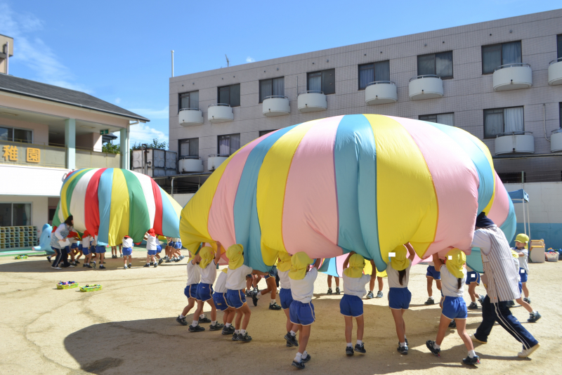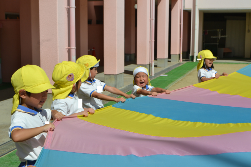 本日の年中組の体育では、パラバルーンの練習を園庭で行いました!