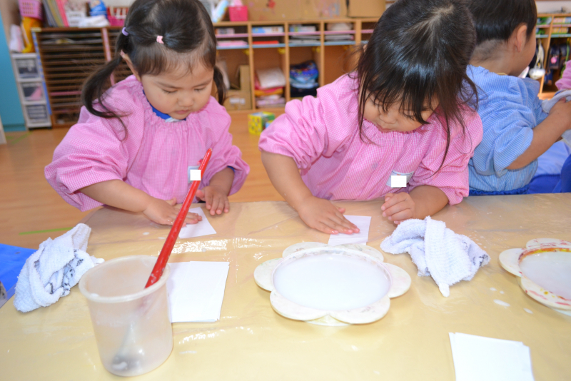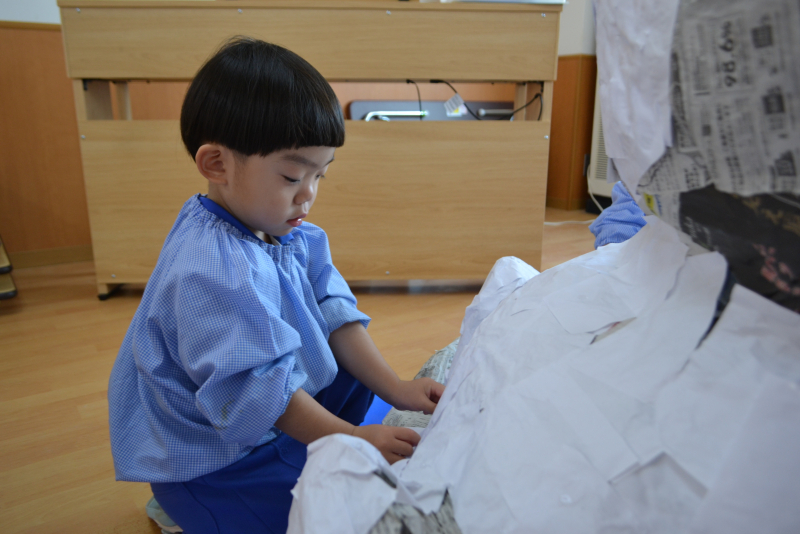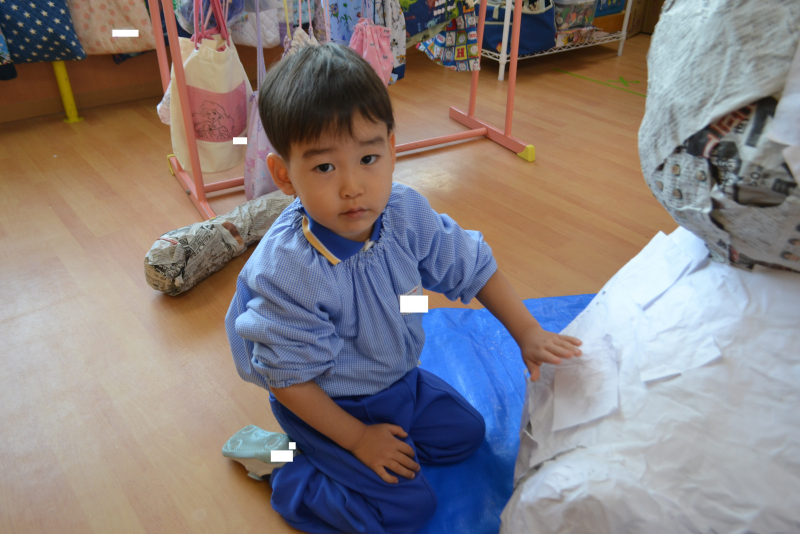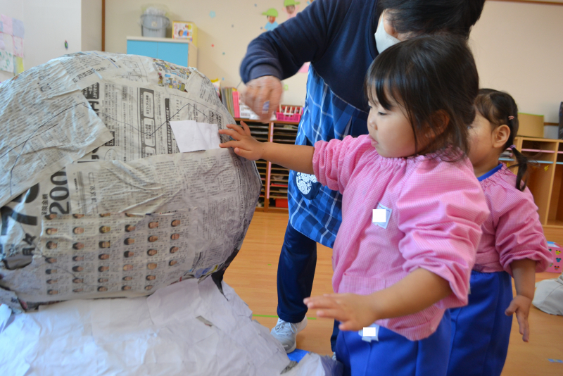 白い紙にのりを付けて、新聞紙で作った大きな土台に貼っていきました☆彡