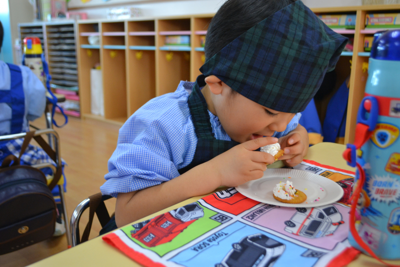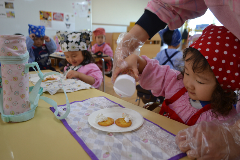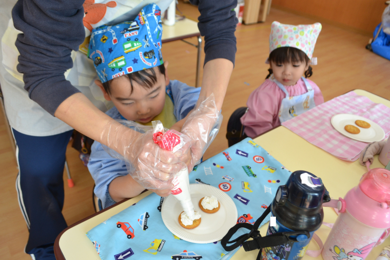 リッツに生クリームやチョコレートソースを選んで、先生と一緒にかけました☆彡