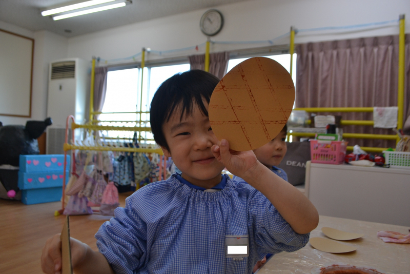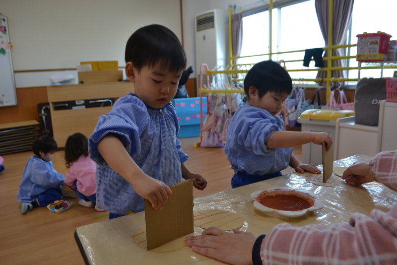 今日のふたば組さんは、3月の絵に向けてスタンプをしました♬