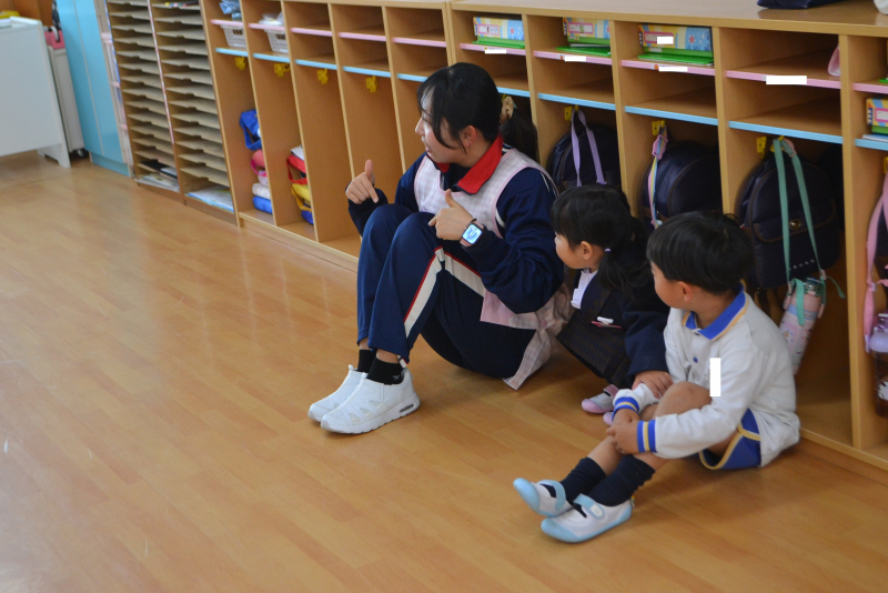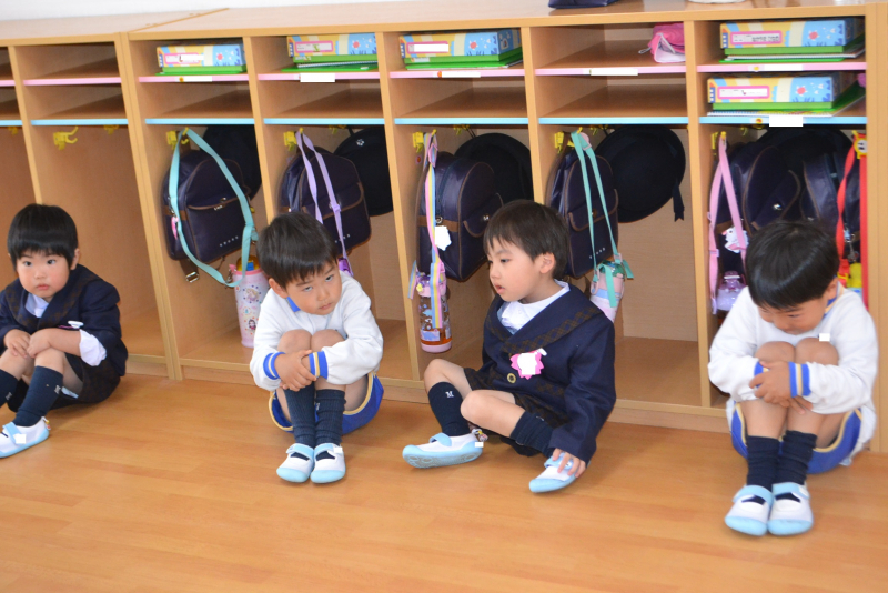 今日は、年少組さんが朝の用意とロッカーの座り方の
