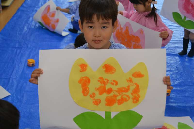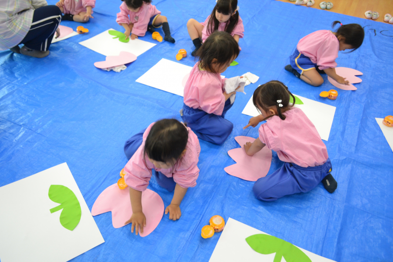 昨日は絵の具でお花に色付けをし、今日は大きな画用紙にのりを使って